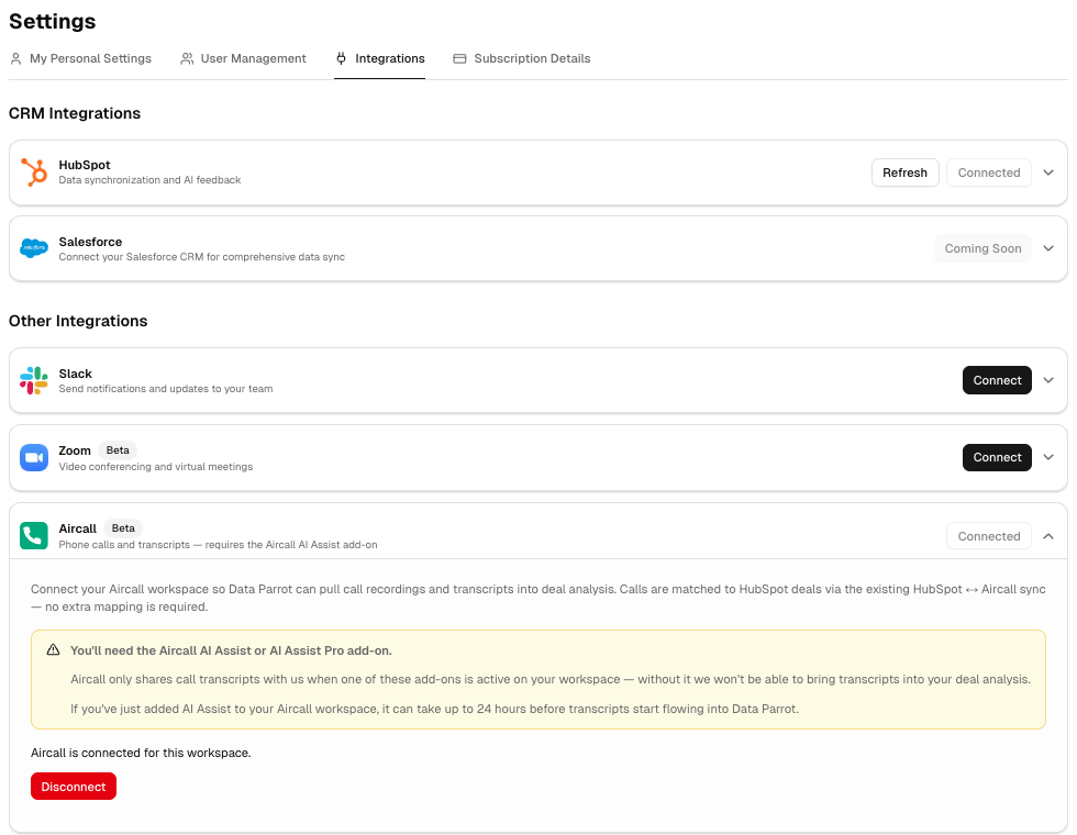 Aircall integration: Connect your Aircall workspace to Data Parrot and we'll pull call recordings and AI Assist transcripts into your deal analysis automatically. Requires the Aircall AI Assist or AI Assist Pro add-on. Connect it from Settings → Integrations, or see the Aircall integration guide for setup details.