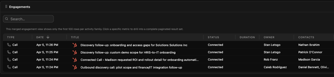 At the bottom of the page, the Engagements table shows the individual engagement records that match your filters. Click any engagement title to open it in HubSpot.