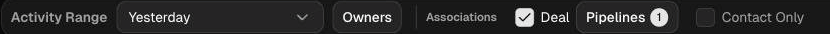 Choose the activity range, owners, associations, and pipelines to focus on the data that matters.