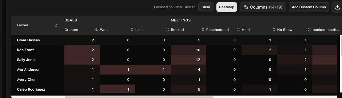 - Heatmap for quick scans: Turn on the heatmap to instantly see who's most active and where gaps exist.