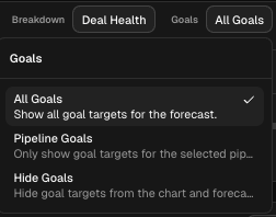 - Breakdown. choose how the forecast is sliced (e.g. Deal Health, Purchase Intent, AI Forecast Category). The bars stack and the table rows group by whatever you pick here.