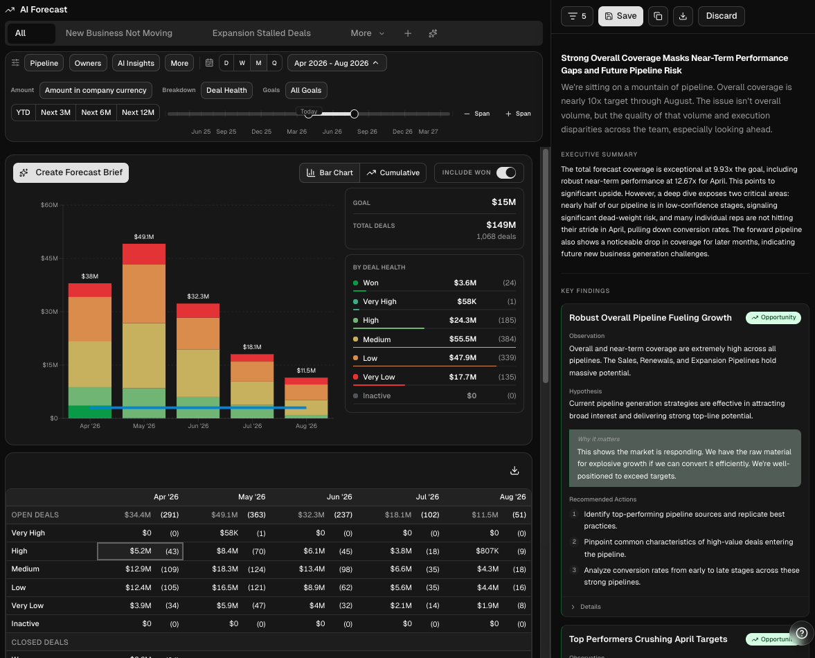 The AI Forecast page combines saved views, filters, a forecast chart, a forecast table, and an AI-generated brief so you can investigate your pipeline from any angle.