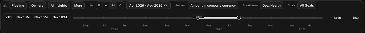 YTD,Next 3M,Next 6M,Next 12M) and a draggable timeline. - Span +/− expands or contracts the visible range one period at a time.