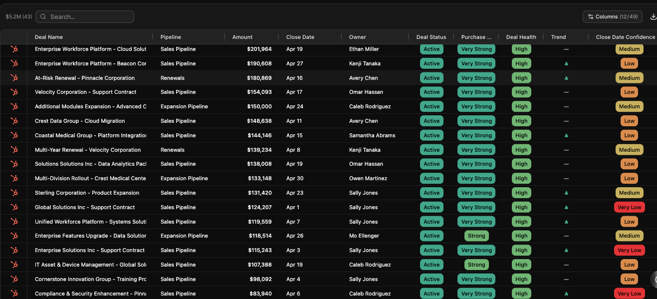 - Stage Confidence: AI confidence the deal is in the right stage (Very High, High, Medium, Low, Very Low)