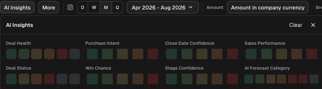 - AI Insights. open the full grid of AI Analysis categories: Deal Health, Purchase Intent, Close Date Confidence, Sales Performance, Deal Status, Win Chance, Stage Confidence, and AI Forecast Category.