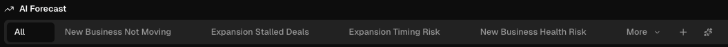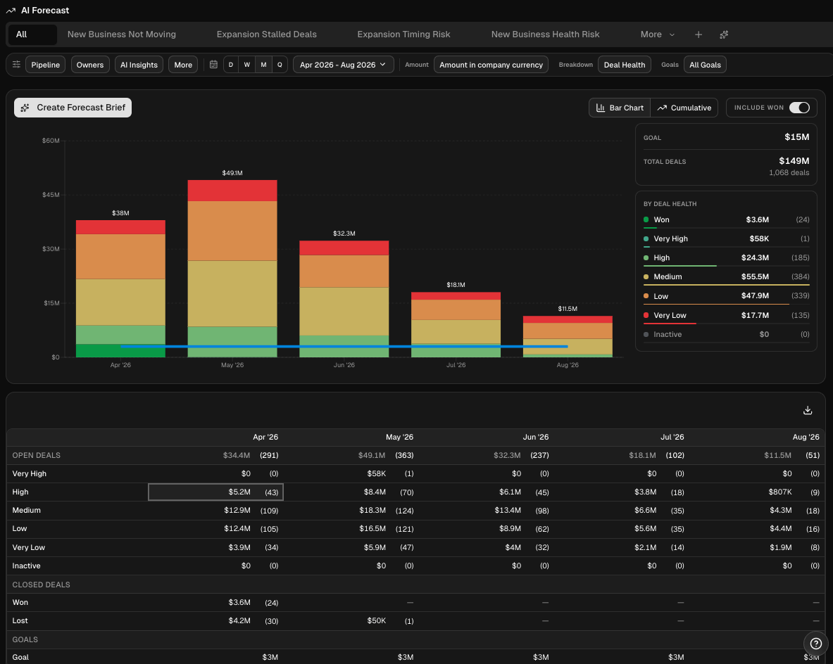 The AI Forecast provides you with an interactive, AI-powered view of your Sales Forecast. You can set your filters, determine your time series grouping, and categorize the forecast bars by AI deal health, forecast category, deal status, customer intent, and more.