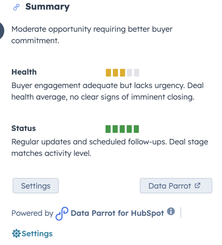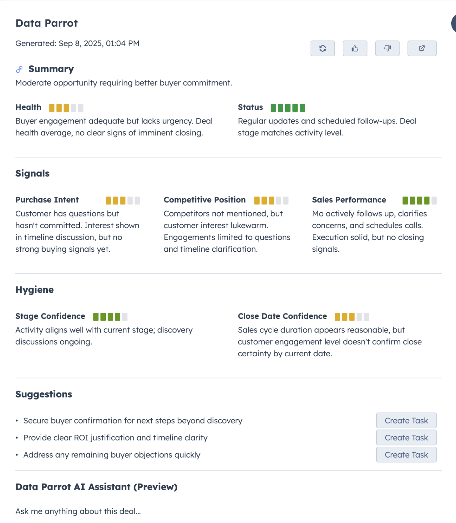 The Data Parrot HubSpot UI Extension brings AI-powered sales intelligence directly into your HubSpot deal records. Instead of switching between Data Parrot and HubSpot, you can view deal health, get AI recommendations, chat with your deals, and take action, all without leaving HubSpot.