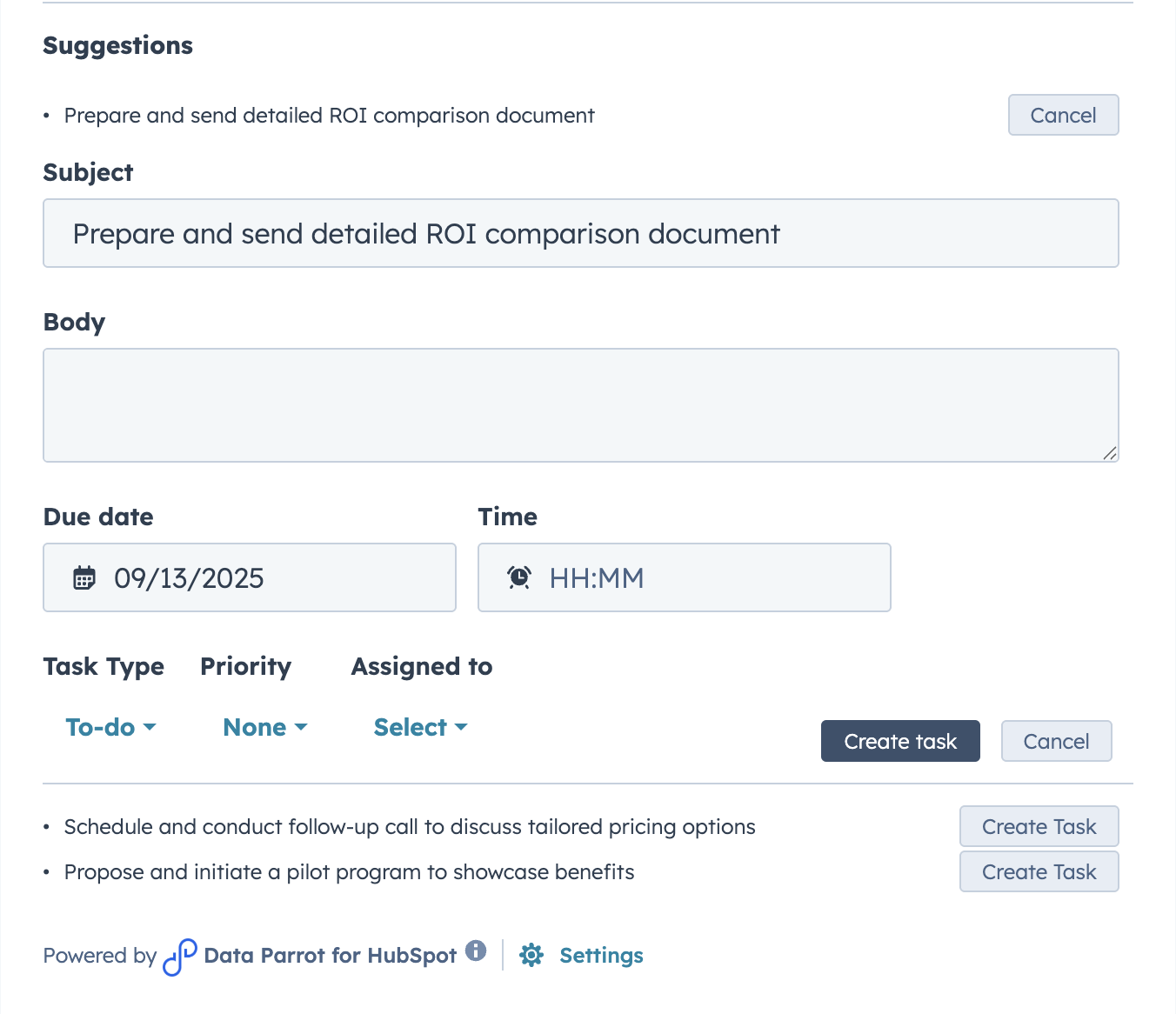 - Task Creation: Convert AI suggestions into HubSpot tasks with one click