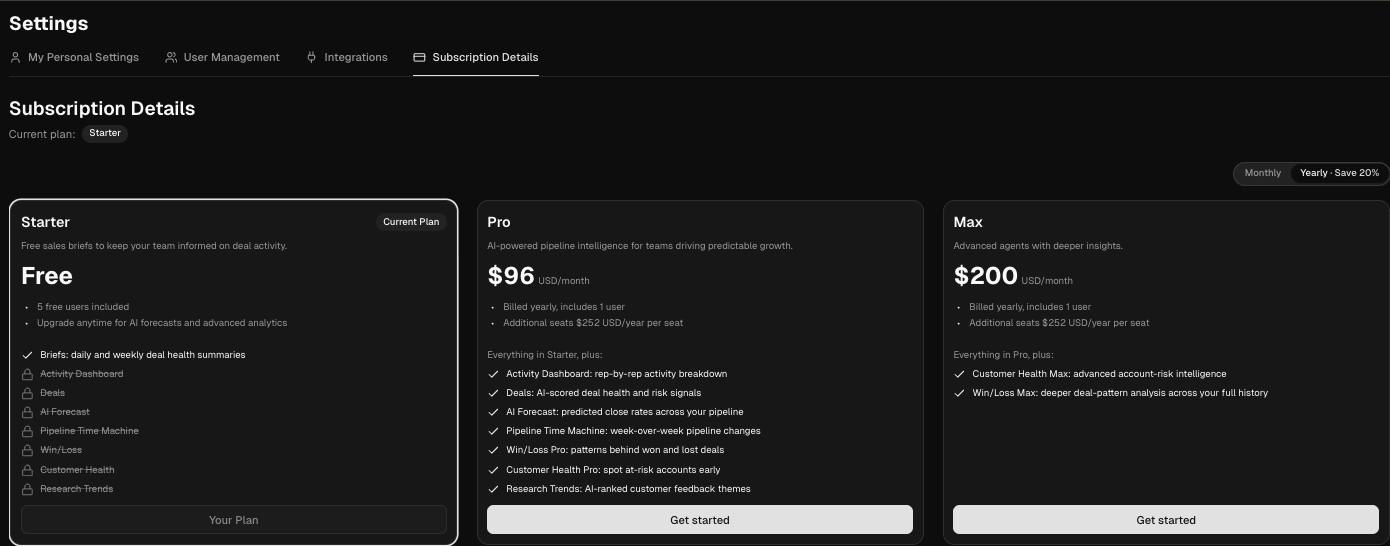 If you are on the Starter (free) plan, the Subscription Details tab shows the available plans side by side: Starter, Pro, and Max. Each plan card lists what is included and what is locked behind a paid plan.