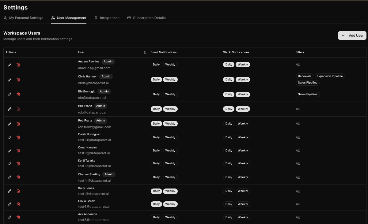The User Management tab is where administrators control team access, notification preferences, and notification filters for everyone in your workspace.